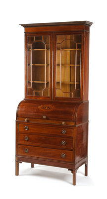 in two parts, the superstructure having a molded cornice above two glazed doors opening to shelves, the base fitted with the cylinder opening to a fitted interior over a slide and three graduated long drawers, raised on square legs.