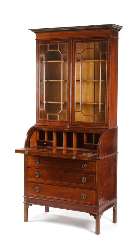 A George III Style Mahogany Cylinder Secretary Bookcase Height 90 x width 34 1/2 x depth 18 1/4 inches.