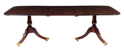 A George III Style Mahogany Double Pedestal Dining Table Height 29 3/4 x length 77 x depth 47 inches.