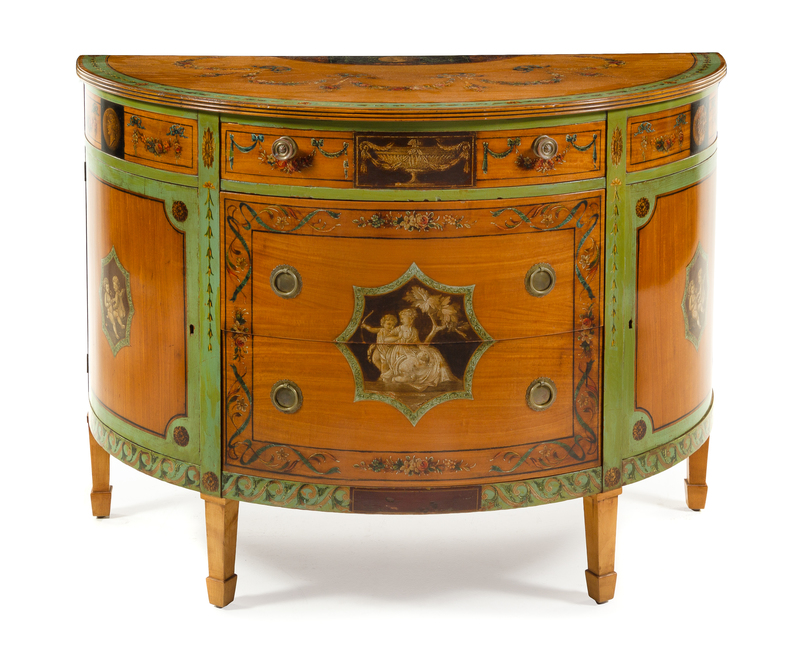 the demilune top painted to show the profile of a lady among ribbon tied floral and bellflower swags, the conforming case fitted with three graduated drawers flanked by two cabinet doors opening to shelves, the drawers and cabinet doors painted with reserves depicting Cupid and a seated lady flanked by cherubs, raised on square tapering legs ending in spade feet.