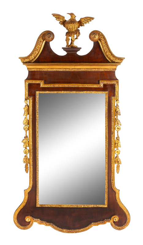 the swan neck crest centered with a spreadwing bird finial, the vertical rectangular mirror set within the shaped frame flanked by hanging bellflowers.
