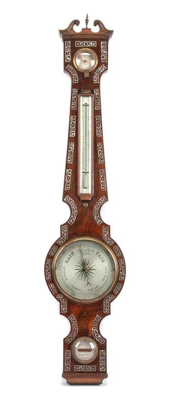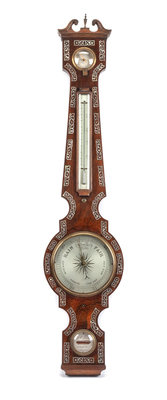 An English Mother-of-Pearl Inlaid Rosewood Barometer Height 37 1/2 inches.