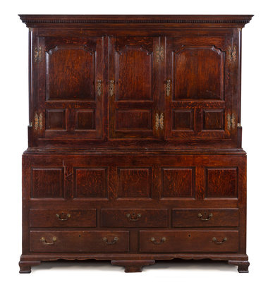 in two parts, the superstructure having a molded cornice above three paneled doors, the base fitted with a series of five drawers, the whole raised on bracket feet.