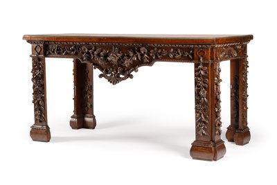 the rectangular top above the frieze heavily carved to show flowering vines and foliate scrolls, raised on similarly carved straight legs.