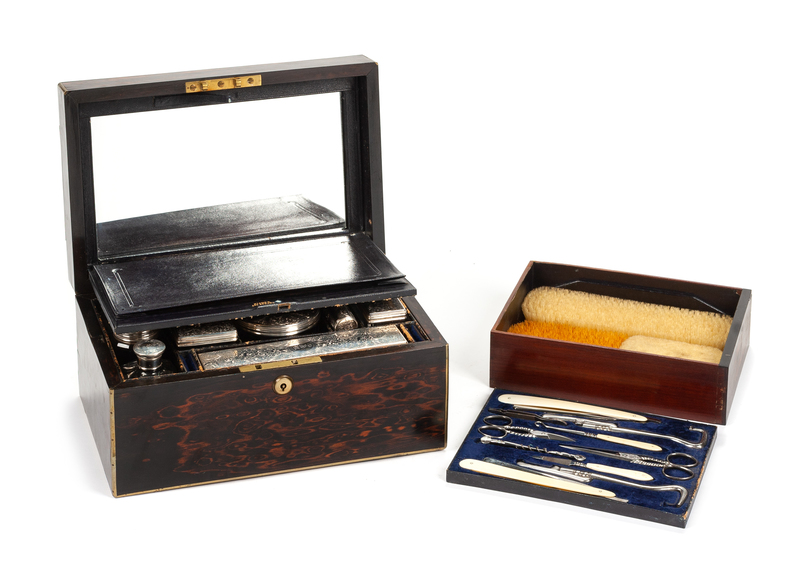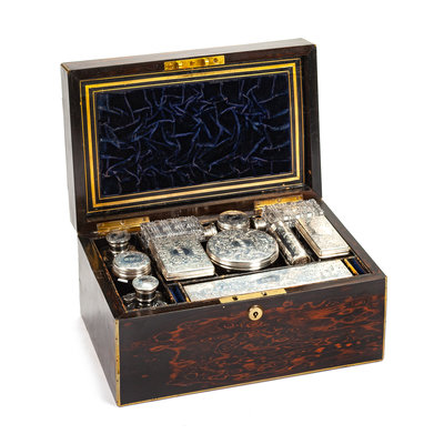 of rectangular form, opening to a fitted interior set with silver mounted boxes and bottles by George Brace of London.