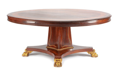A Regency Style Parcel Gilt Mahogany Dining Table Height 30 1/2 x diameter of top 71 inches.