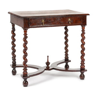 the rectangular top above a single frieze drawer, raised on barley twist legs joined by a curved X-form stretcher and ending in ball feet.
