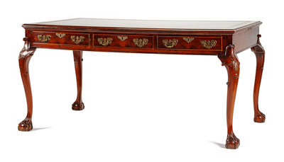 the rectangular inset tooled leather writing surface above two sets of three opposing drawers, raised on carved cabriole legs ending in claw-and-ball feet.