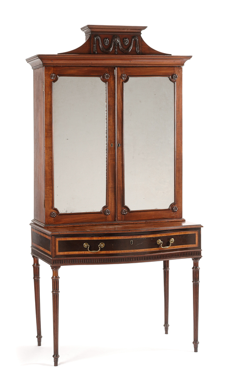 in two parts, the superstructure with a curved crest carved to show festoons spaced with paterae above two mirror inset doors, the base fitted with a single long drawer, raised on cylindrical fluted tapering legs ending in toupie feet.