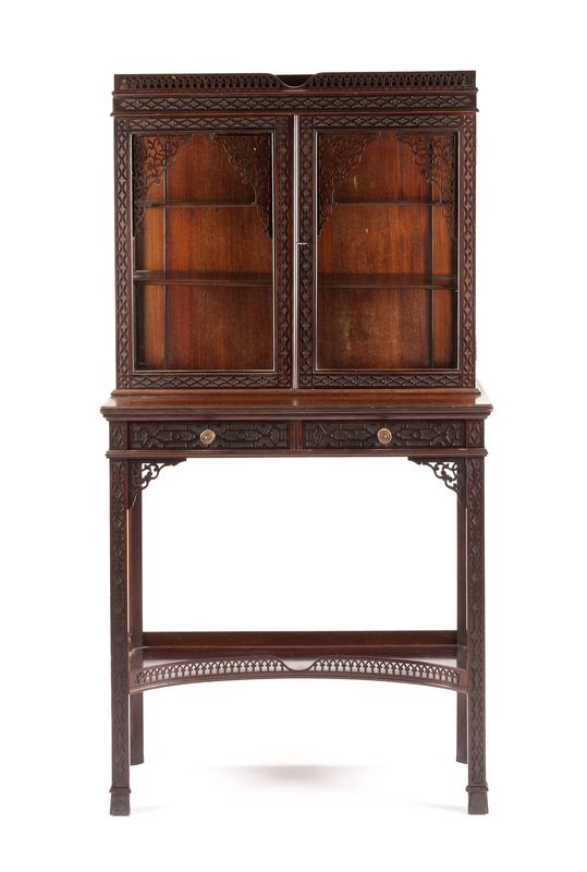 in two parts, the superstructure with a rectangular galleried top above two glazed doors opening to shelves, the base fitted with two drawers raised on straight legs joined by a concave medial shelf, the whole with blind fret carved decoration throughout.