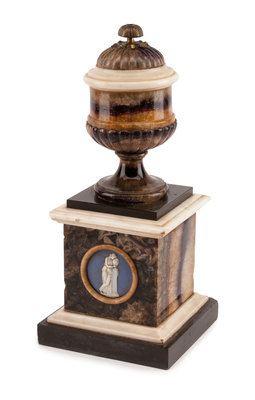 raised on a plinth centered with a circular figural medallion.