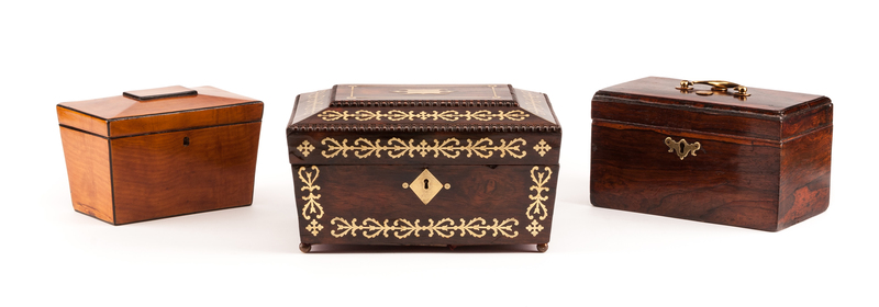Three English Tea Caddies Largest: height 6 x width 11 x depth 8 inches.