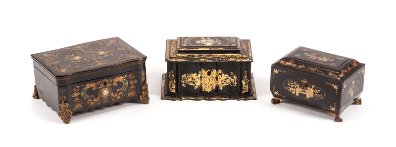 Three English Chinoiserie Boxes Width of largest 10 inches.