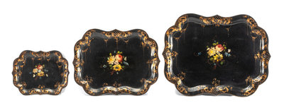 A Set of Three English Papier Mache Trays Width of widest tray 29 1/2 inches.