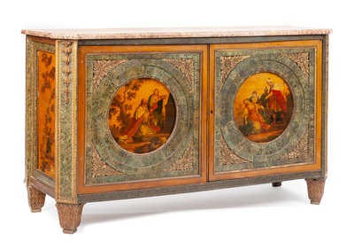 the rectangular marble top with canted corners above the conforming case fitted with two doors, each centered with a circular cartouche depicting figures in a landscape, raised on foliate carved legs.