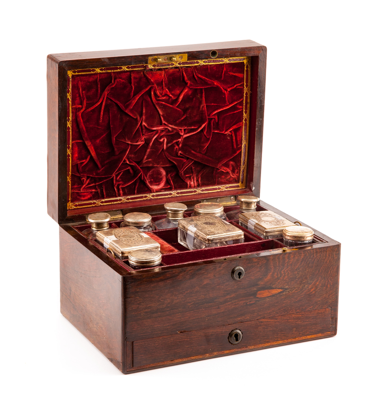 the hinged lid fitted with glass bottles having silver-plate lids.