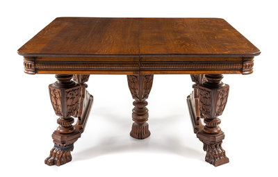 A Victorian Renaissance Revival Oak Extension Table Height 27 x width 54 x depth 54 inches.