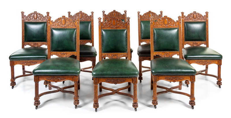 A Set of Eight Victorian Renaissance Revival Oak Dining Chairs Height 42 inches.