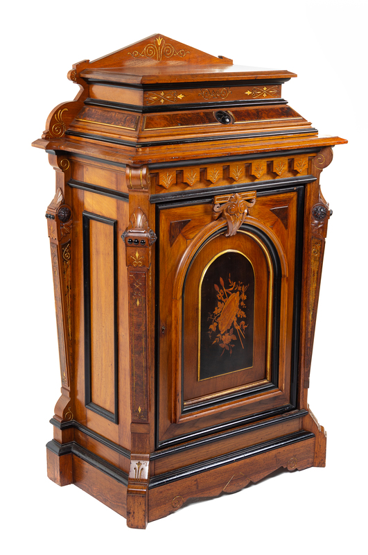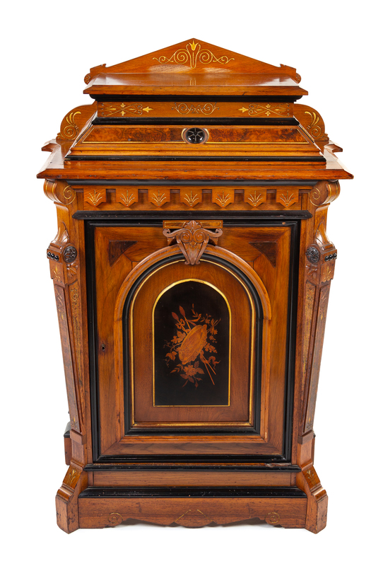 A Victorian Parcel Ebonized Marquetry Cabinet Height 54 x width 35 x depth 18 inches.