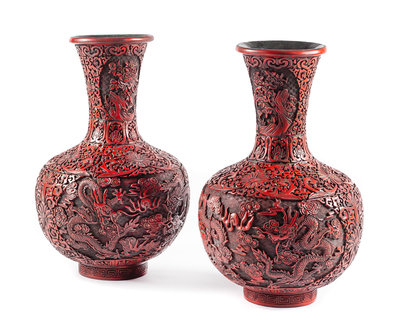 A Pair of Chinese Cinnabar Vases Height 19 inches.