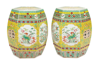 A Pair of Chinese Famille Jaune Porcelain Garden Seats Height 19 inches.