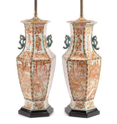 each of hexagonal form, mounted as lamps.