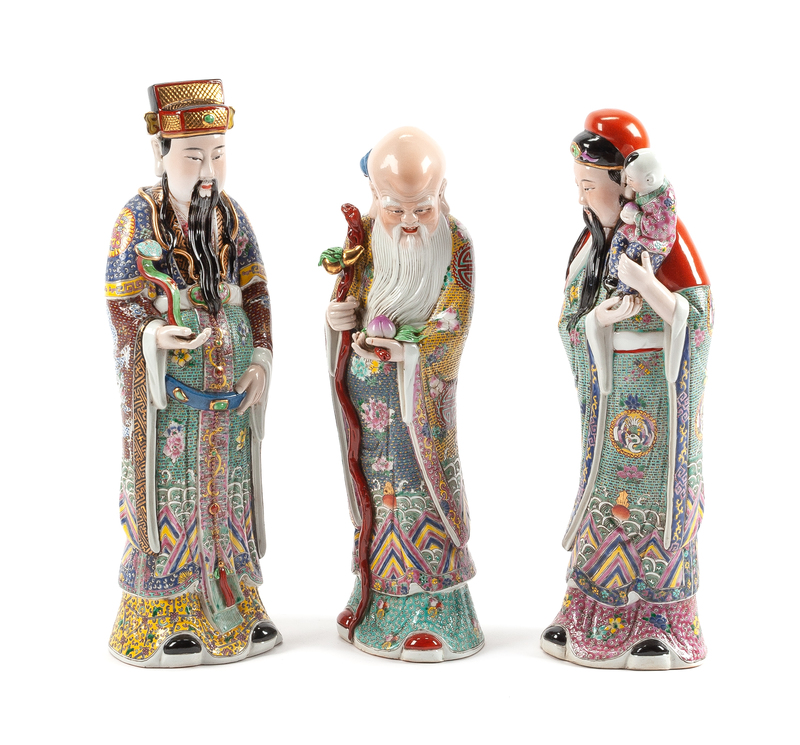 Three Chinese Enameled Porcelain Figures Height of tallest 19 inches.