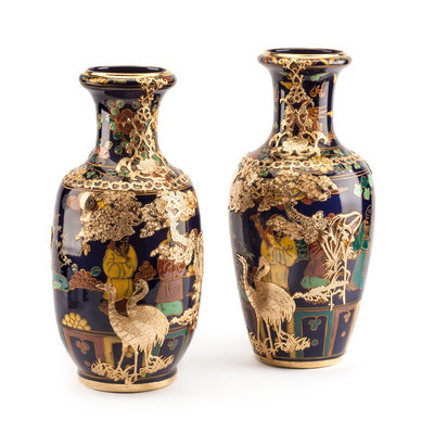 each baluster form body depicting a continuous band of figures, the gilt bronze mounts in the form of cranes.