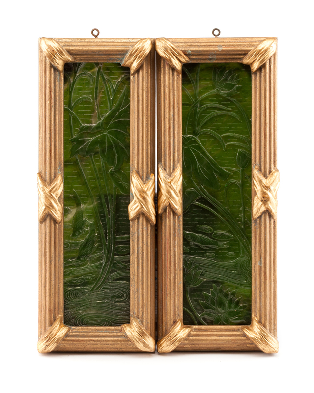A Pair of Chinese Carved Spinach Jade Plaques Height 14 1/2 x width 5 1/2 inches.
