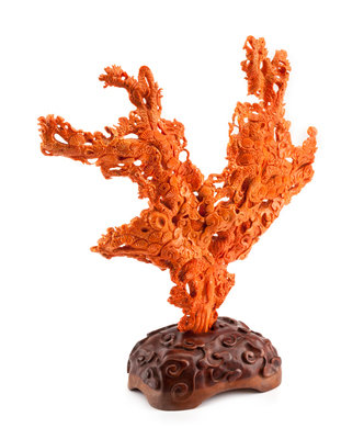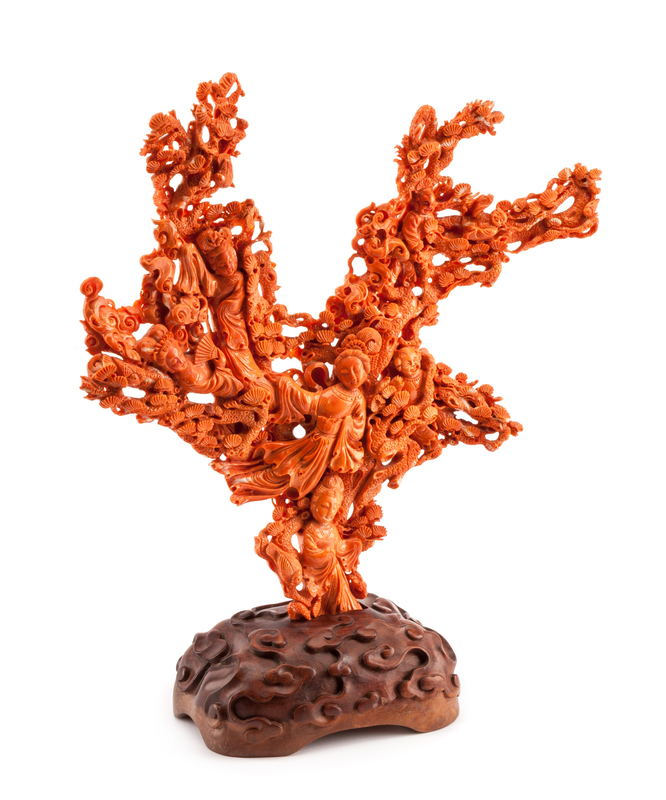 A Chinese Carved Coral Figural Group Height 12 1/2 x width 13 1/2 inches.