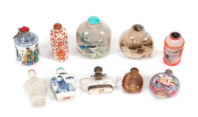 Ten Chinese Snuff Bottles Height of tallest 3 inches.