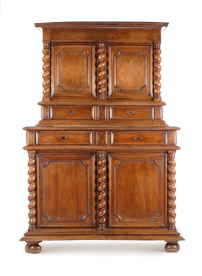 the superstructure fitted with two paneled doors and two drawers, the base fitted with two drawers and two paneled doors, all flanked by barley twist pilasters, the whole raised on bun feet.