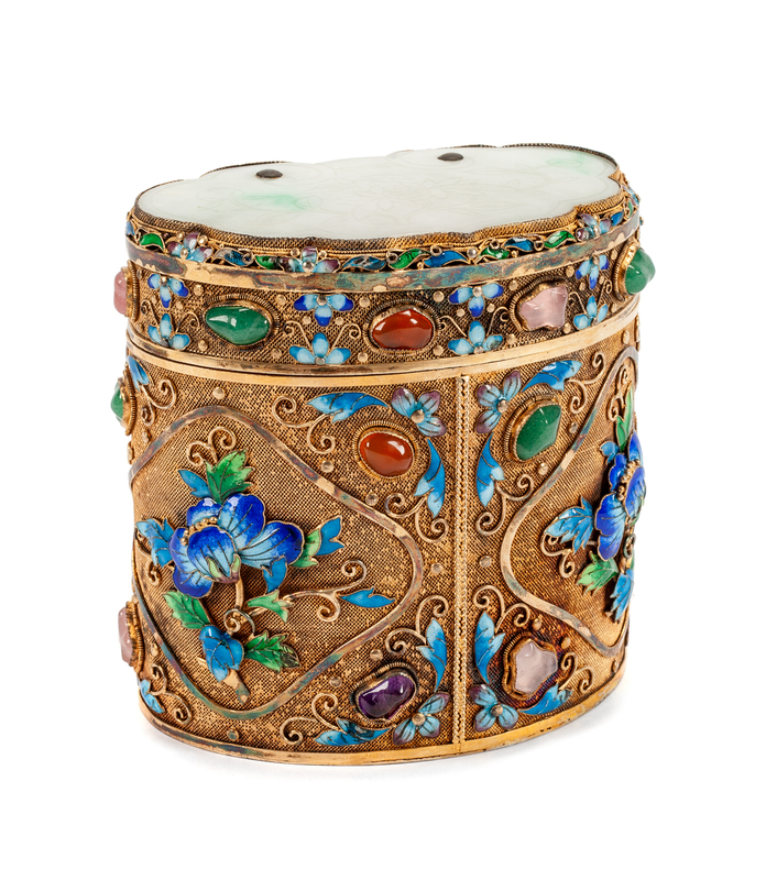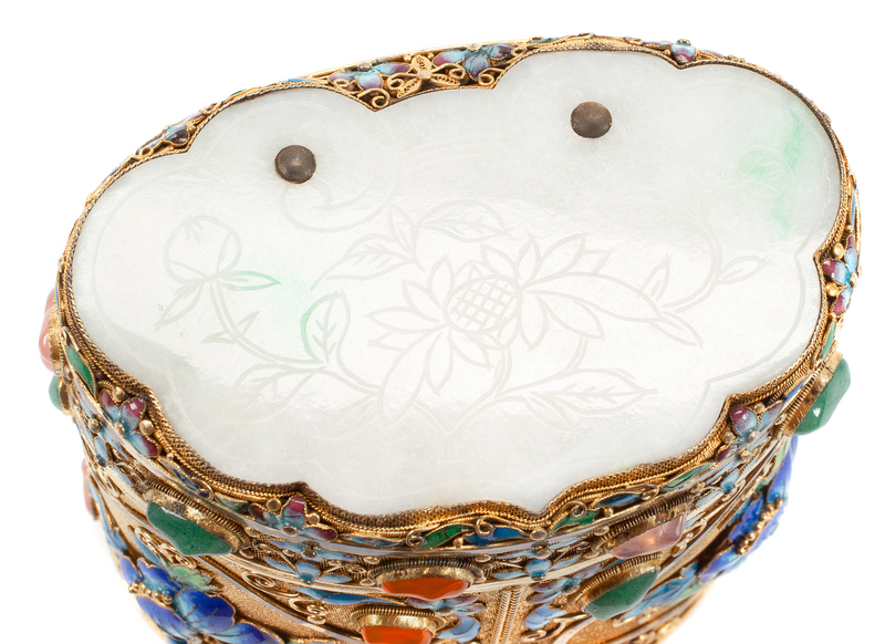 A Chinese Silvered and Enameled Box with a Jadeite Inset Cover Height 4 inches.