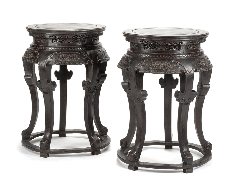A Pair of Chinese Carved Wood Pedestal Tables Height 33 1/2 x diameter of top 24 inches.