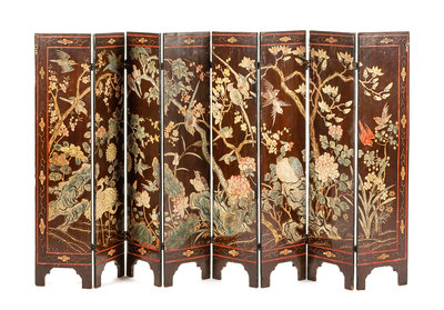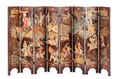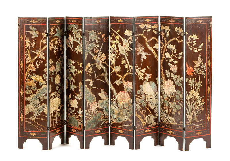 A Chinese Coromandel Eight-Panel Floor Screen Height 43 1/2 x width of each panel 10 inches.