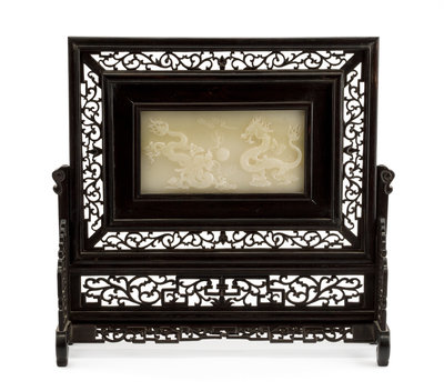 the jade panel carved to show two dragons chasing the flaming pearl.
