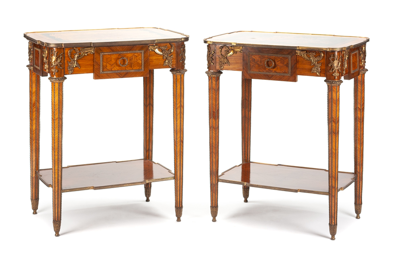 A Near Pair of Louis XVI Style Gilt Bronze Mounted Parquetry Tables Height 34 1/4 x width 28 1/4 x depth 20 1/2 inches.