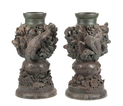 A Pair of Japanese Bronze Urns Height 40 inches.