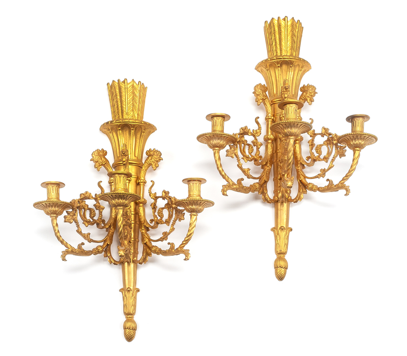 A Pair of Louis XVI Style Gilt Bronze Three-Light Sconces Height 23 1/4 inches.