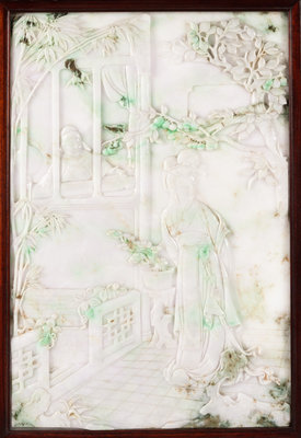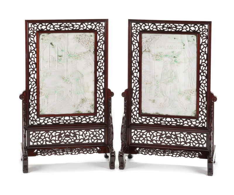 A Pair of Framed Burmese Jade Table Screens Height overall 38 x width 25 1/2 x depth 14 inches.