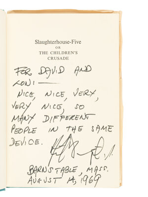 Second printing. PRESENTATION COPY INSCRIBED BY VONNEGUT TO DAVID AND LONI HAYMAN, "Nice, nice, very nice, so many different people in the same device. Barnstable, Mass. August 14, 1969." Vonnegut's scathing anti-war classic was based on his own experiences as a POW who survived the Allied bombing of Dresden in 1945.
