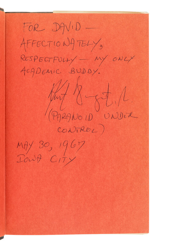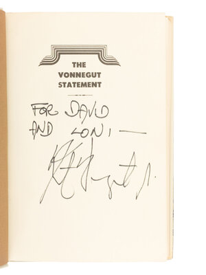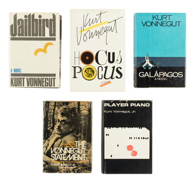 Player Piano. New York: Holt, Rinehart, & Winston, 1966. PRESENTATION COPY INSCRIBED BY VONNEGUT TO DAVID HAYMAN, "Affectionately, respectfully - my only academic buddy. Kurt Vonnegut Jr. (PARANOID UNDER CONTROL). May 30, 1967, Iowa City." -- Jailbird. 1979. -- Galapagos. 1985. FIRST TRADE EDITION. -- Hocus Pocus. New York: G.P. Putnam's Sons, 1990. FIRST EDITION. -- KLINKOWITZ, Jerome and John SOMER, editors. The Vonnegut Statement: Original Essays on the Life and Work of Kurt Vonnegut, Jr. with a Bibliography. 1973. FIRST EDITION. PRESENTATION COPY INSCRIBED BY VONNEGUT TO DAVID HAYMAN, "For David and Loni."