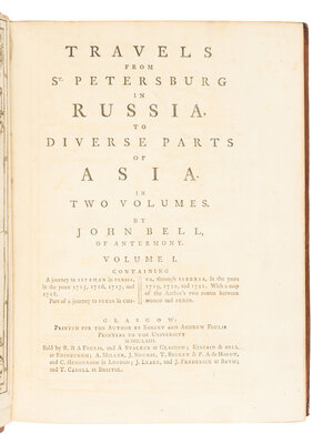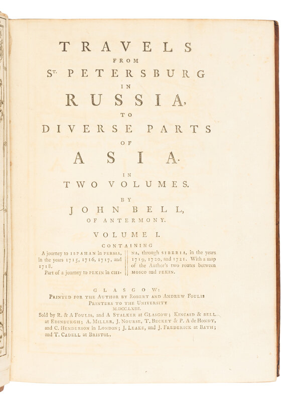 BELL, John (1691-1780). Travels from St. Petersburg in Russia to Diverse Parts of Asia. Glasgow: Robert and Andrew Foulis for the author, 1763.