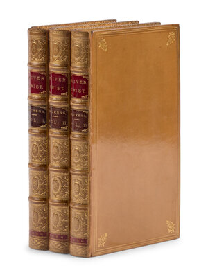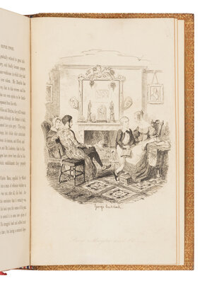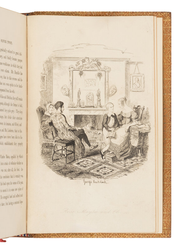 FIRST EDITION OF THE FIRST ENGLISH NOVEL TO FEATURE A YOUNG CHILD AS A PROTAGONIST. Mixed issue containing almost all the first issue points listed in Gimbel: the "Fireside" plate at p.312 in vol.3, and the authorship ascribed to "Boz" on title-pages in vol.1&2; vol.3 title-page with the canceled title correctly listing Dickens as the author (second issue, Smith's first state with "pilaster" for "pier" on p.164). When Bentley decided to publish Oliver Twist in book format before its completion in Bentley's Miscellany magazine, Cruikshank had to rush to finish the illustrated plates. Dickens didn't review the plates until the eve of publication, and he objected to the "Fireside" plate (present here) which depicted Oliver at Rose Maylie's knee with Harry and Mrs. Maylie gathered around the living room fire. Cruikshank revised the illustration, using the same title ("Rose Maylie and Oliver"), to show Rose and Oliver standing before Oliver's mother's church memorial. The altered plate was used in later issues of Oliver Twist in book form, as well as in the conclusion of the periodical run. Eckel, p.59-60; Gimbel A27; Smith I:4.