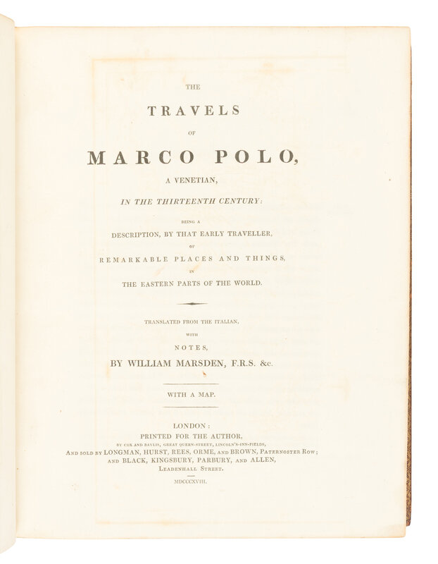 POLO, Marco (1254-1324). The Travels of... Translated and edited by William Marsden. London: Cox and Baylis for the Author, 1818.