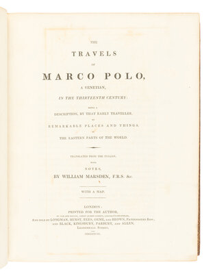 ROBERT PEEL'S COPY OF THE FIRST EDITION of Marsden's celebrated translation of Marco Polo's travels across Asia, originally published in German in 1477. This edition was preceded in English only by John Frampton's rare translation of 1579.