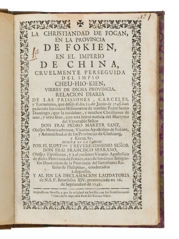 [With:] SERRANO, Francisco. La Christiandad de Fogan en la provincia de Fokien, en el imperio de China. Manila: Correo Viejo, 1749. 8vo. Title-page with woodcut border. Modern half suede, marbled boards. FIRST EDITION.
