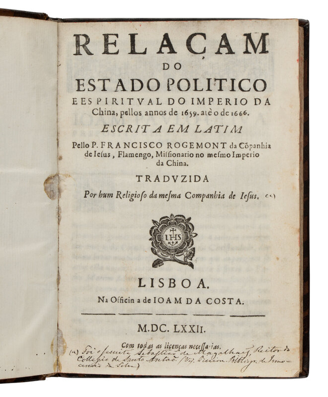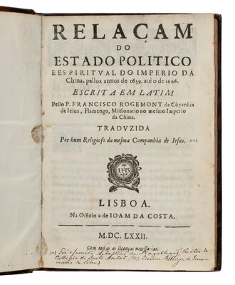 ROUGEMONT, Francisco (1624-1676). Relacam do estado politico e espiritual do imperio da China, pellos annos de 1659...1666. Lisbon: Joam de Costa, 1672.