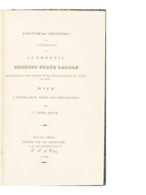 SHUCK, Jehu Lewis (1812-1864). Portfolio Chinensis: or A Collection of Authentic Chinese State Papers Illustrative of the History of the Present Position of Affairs in China. Macao, China: Printed for the translator by F.F. de Cruz, 1840.
