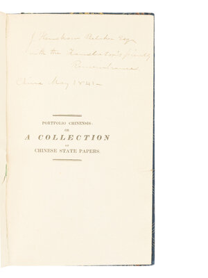 FIRST EDITION. INSCRIBED BY THE TRANSLATOR on the half-title. This work prints important Chinese documents relating to the First Opium War (1839-1842), then in progress. These include the edicts against the taking and trafficking in opium, as well as the draconian edicts of Governor Lin against English traders following the British failure to curb imports of raw opium. This last was apparently appended at short notice, thanks to the loan by the East India Company of Morrison's movable Chinese type, earlier parts of the work being printed from woodblock. RARE: Only one copy has appeared at auction in over 50 years. Cordier Sinica, 1905-1906; Lust 478.